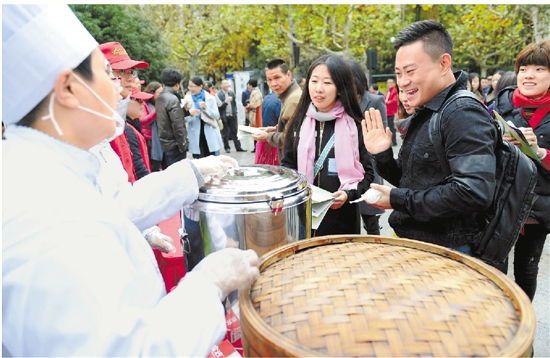 近日,杭州苏堤春晓微笑亭附近,一群佩戴党徽的服务者为过往游客分发热气腾腾的馒头、飘着清香的花茶,为杭城增添浓浓暖意。 记者 戴睿云 董旭明 摄