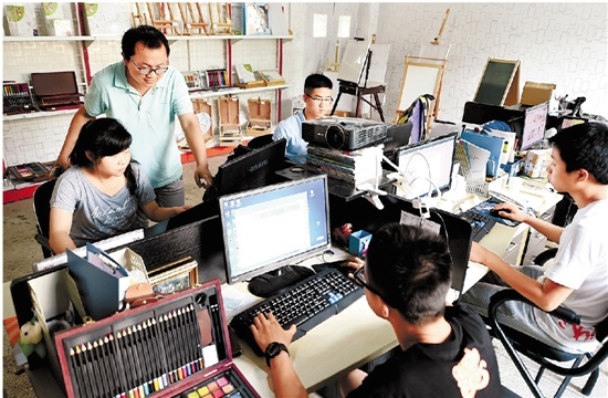 | “互联网+”为大学生创业打开了新空间。背靠义乌国际商贸名城的义乌工商职业技术学院,为创业学生开辟特区。目前学院有1800余名在校生投身创业实践活动,年收入3500余万元,其中电子商务创业收入2800万元。图为今年夏天,义乌工商学院2012级e创电商班学生通过网络销售画材。 龚献明 摄 |