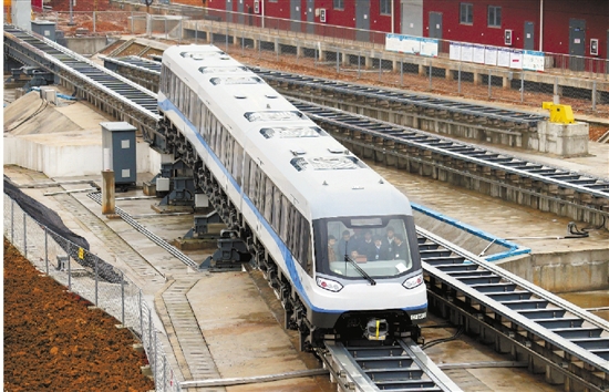 12月9日,磁浮列车在长沙行驶。由中国铁建铁四院设计施工总承包的湖南长沙中低速磁浮铁路工程将于12月10日开始联调联试。长沙中低速磁浮铁路是中国首条自主研发的磁悬浮线,西起长沙南站,东至黄花机场,线路全长18.5公里,2014年5月开工建设,将于近期开通试运行。 新华社记者 邢广利 摄