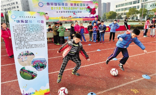 12月12日,杭州江干区举行中小学生社团体验节,以喜迎G20峰会、展示社团风采。图为天成教育集团的“快乐足球”社团在秀球技。 叶寒青 李凌婧 摄