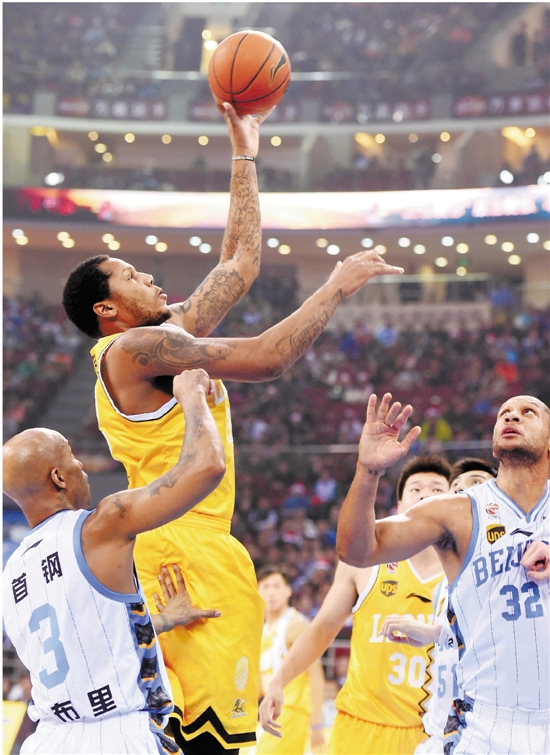 浙江广厦队球员霍尔曼(左二)在比赛中投篮。 新华社发