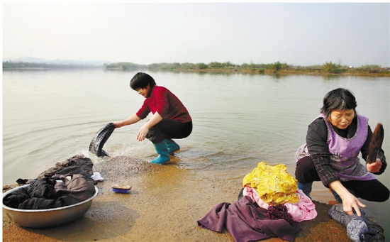 12月23日,衢江区后溪镇泉井边村的江山港边,两位农妇在河里洗衣。“以前,水很干净,可以浣洗,不过这七八年,河水变褐色变臭,再也没有人来河边洗衣服了。”其中一位农妇说,“五水共治”后,江山港水质明显改善,到河边洗衣服的村民又回来了。 徐元昌 摄