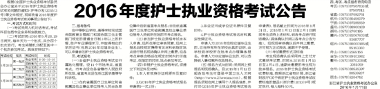 根据《全国护士执业资格考试委员会办公室关于2016年护士执业资格考试有关问题的通知》(护考办发〔2015〕3号)等文件规定,现将我省2016年度护士执业资格考试有关事项公告如下: