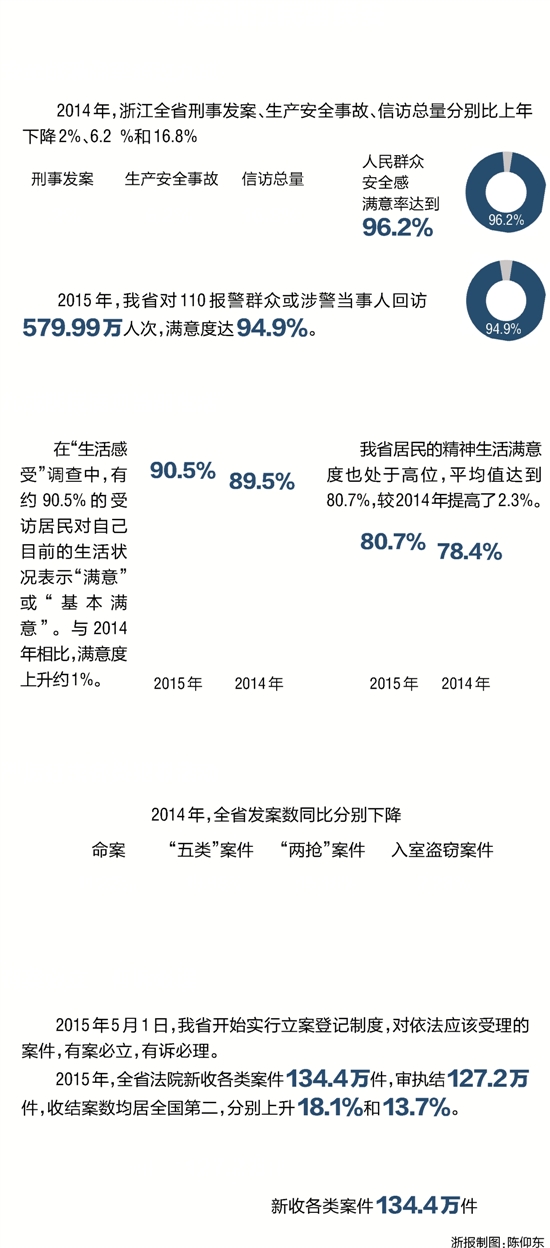2014年,浙江全省刑事发案、生产安全事故、信访总量分别比上年下降2%、6.2 %和16.8%