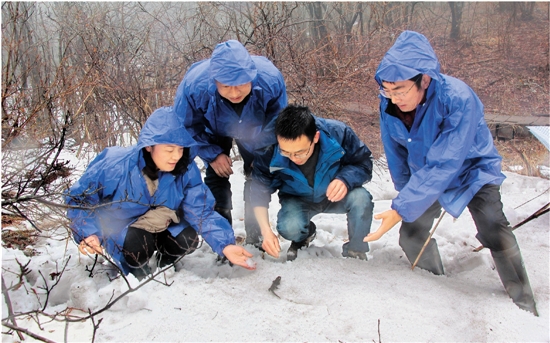 | 在-7℃的安吉龙王山山顶,记者(左一)和自然保护区的工作人员找到了安吉小鲵。 俞立鹏 摄 |