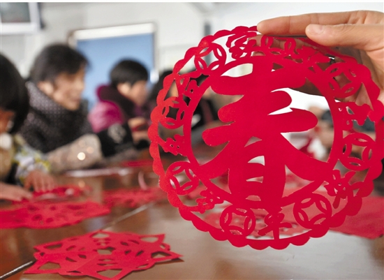 2月1日,海盐县于城镇吕冢村的村民们聚集在一起剪纸,增添喜庆气氛。 本报记者 叶寒青 通讯员 范冰洁 摄
