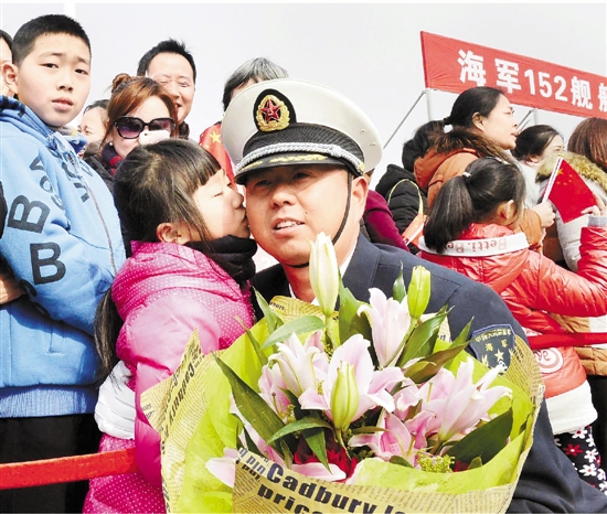 2月5日,历时309天,总航程达5.23万海里的我国海军152舰艇编队顺利返回靠上舟山某军港码头,官兵们回家与亲人团聚过年。 通讯员 胡社友 摄