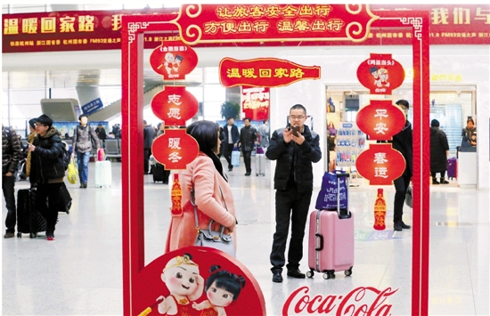 2月5日,铁路杭州站内年味浓浓,旅客们纷纷在候车室的温暖门前留影。 本报记者 邵全海 摄