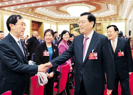 3月5日下午,中共中央政治局常委、全国人大常委会委员长张德江来到他所在的浙江代表团,同代表们一起审议政府工作报告。