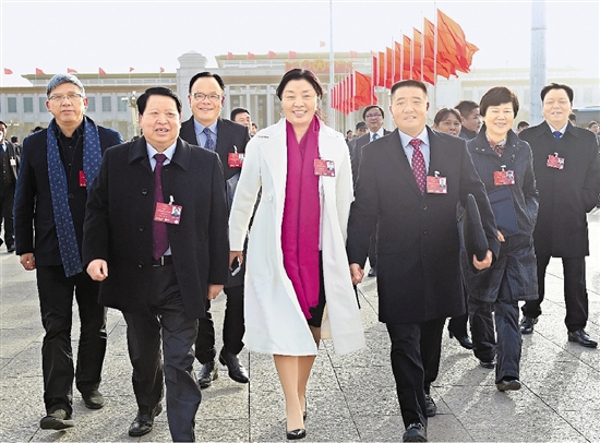 3月5日上午,出席十二届全国人大四次会议开幕会的浙江代表步入人民大会堂。 本报记者 黄曙林 摄