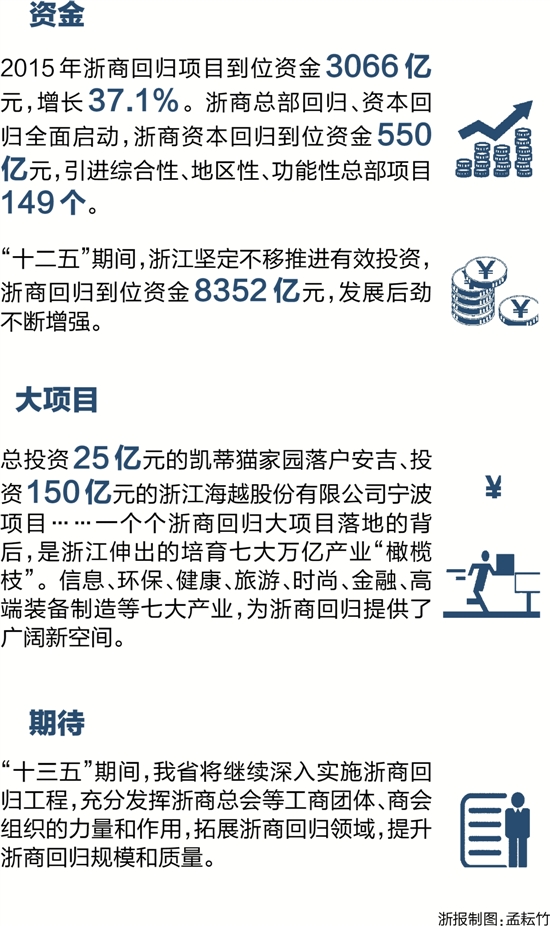 2015年浙商回归项目到位资金3066亿元,增长37.1%。浙商总部回归、资本回归全面启动,浙商资本回归到位资金550亿元,引进综合性、地区性、功能性总部项目149个。