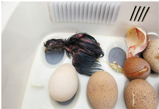 一只刚刚人工孵化出来的黄腹角雉雏鸟。