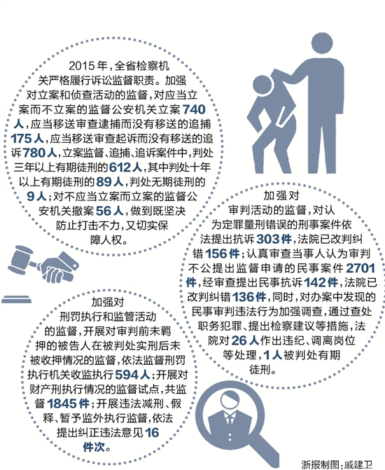 加强对审判活动的监督,对认为定罪量刑错误的刑事案件依法提出抗诉303件,法院已改判纠错156件;认真审查当事人认为审判不公提出监督申请的民事案件2701件,经审查提出民事抗诉142件,法院已改判纠错136件,同时,对办案中发现的民事审判违法行为加强调查,通过查处职务犯罪、提出检察建议等措施,法院对26人作出违纪、调离岗位等处理,1人被判处有期徒刑。
