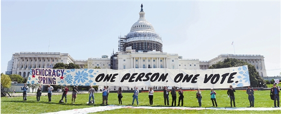 4月15日,在美国首都华盛顿,集会者手持反对金钱政治的巨幅标语在国会大厦前参加示威活动。 新华社记者 鲍丹丹 摄