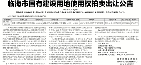 临海市国有建设用地使用权拍卖出让公告