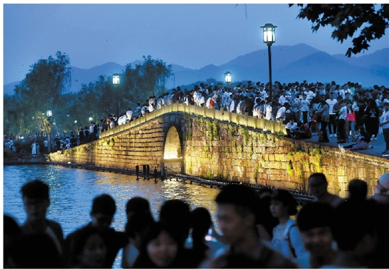华灯初上,在灯影交错中,断桥上人潮涌动。