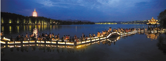 长桥上许多市民游客在欣赏西湖夜景。 本报记者 吴煌 摄