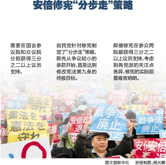 自民党针对修宪制定了“分步走”策略,即先从争议较小的条款开始,直至达到修改宪法第九条的终极目标。