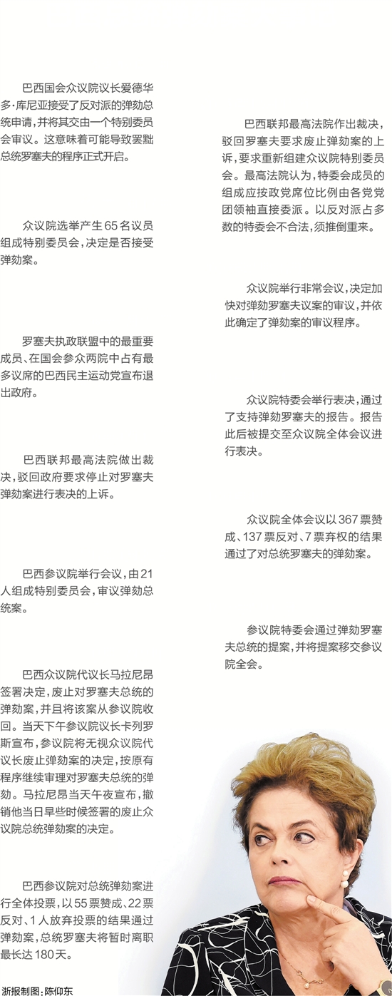 巴西联邦最高法院作出裁决,驳回罗塞夫要求废止弹劾案的上诉,要求重新组建众议院特别委员会。最高法院认为,特委会成员的组成应按政党席位比例由各党党团领袖直接委派。以反对派占多数的特委会不合法,须推倒重来。