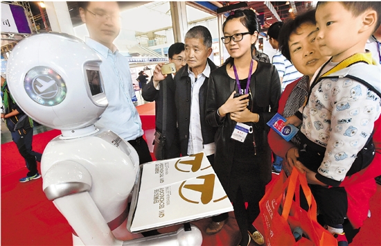 | 5月16日,2016长三角(嘉兴)智能机械装备暨3D打印博览会在嘉兴国际会展中心开幕,来自全国的400多家企业参展,各类机器人、喷涂机械手、码垛机械手及3D打印等高科技产品和技术纷纷亮相。图为参观者正在和机器人对话,这款机器人是嘉兴一家科技企业的产品。 本报记者 叶寒青 通讯员 李剑铭 摄 |