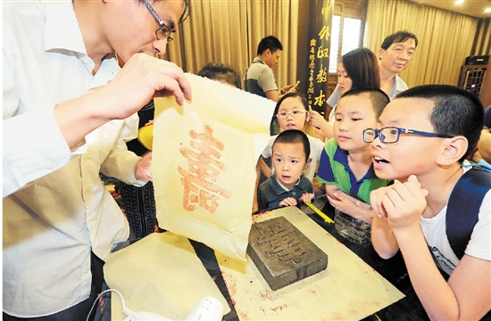6月11日,杭州吴山景区邀请市民带着孩子,跟着文物专家看了山林间的“宝贝”摩崖石刻群,还动手体验了拓片制作等传统工艺。 本报记者 林云龙 摄