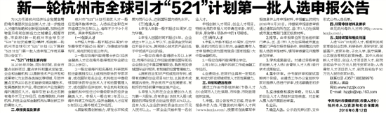 为大力引进杭州经济社会发展急需的海外高层次创业创新人才,进一步推进人才强市战略和创新驱动战略,加快经济转型升级和创新活力之城建设,根据市委、市政府《新一轮杭州市全球引才“521”计划实施意见》精神,现就新一轮杭州市全球引才“521”计划(以下简称“521计划”)第一批人选申报工作有关事项公告如下: