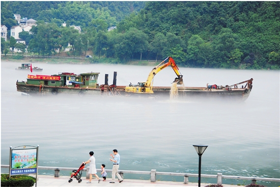 6月11日,在建德市新安江畔洋安大桥附近的江面上,施工单位正对江底淤泥进行清运。今年4月以来,建德对洋安大桥至彩虹桥长3.5公里的流域进行分段清淤,进一步增强新安江的防汛抗汛能力。 宁文武 徐小民 摄