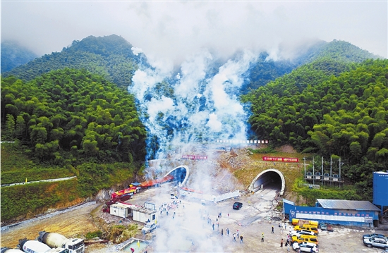 6月25日,金华义乌高寿尖隧道左线贯通,自此,义(乌)武(义)快速公路全线顺利贯通。开通后,义乌至武义的车程将由原来的一个半小时缩短为半小时。 本报记者 梁臻 摄