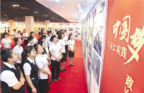 7月1日,由省文化厅、浙江日报报业集团主办的“中国梦与浙江实践——庆祝中国共产党成立95周年图片展”在浙江图书馆开幕。 本报记者 吴元峰 徐彦 摄