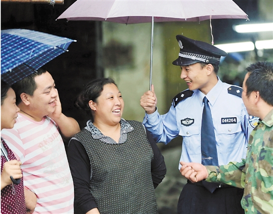 2013年10月9日,诸暨市公安局枫桥派出所民警吴嘉军(右二)冒雨来到枫桥镇走村访户,化解矛盾。 本报记者 徐斌 摄