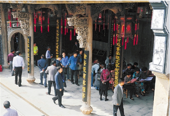 2016年4月,来访者在东阳市江北街道甘东文化礼堂参观。