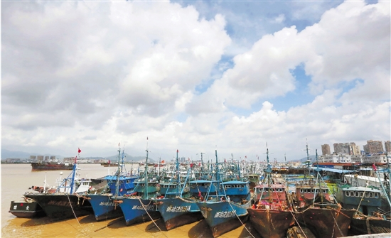 7月6日,瑞安市防指启动防台风Ⅳ级应急响应,做好台风“尼伯特”防御工作。图为渔船在飞云江内渔港锚地安全停泊。