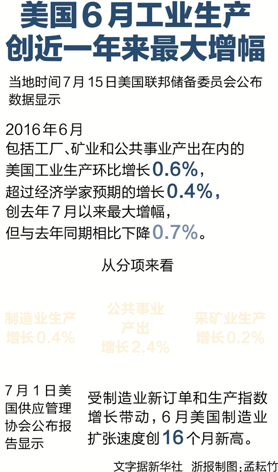 受制造业新订单和生产指数增长带动,6月美国制造业扩张速度创16个月新高。