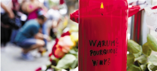 7月23日,在德国慕尼黑,一根写着“为什么”字样的蜡烛放置在枪击案现场附近。 新华社发