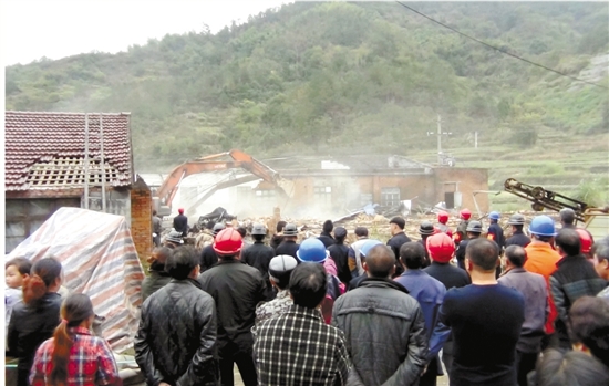 天台县深入开展严格执法、保护资源“亮剑行动”,集中整治历史遗留违法用地,逐一销号清零。图为三合镇拆违现场。