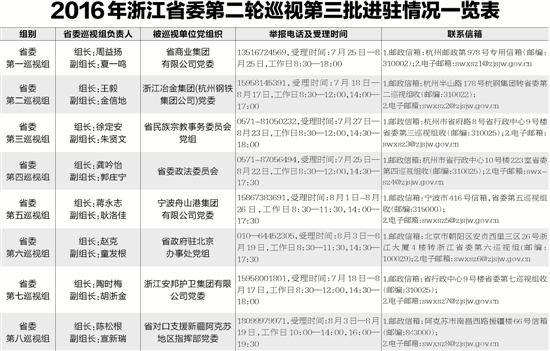 | 省委 第六巡视组 | 组长:赵克 副组长:童发根 | 省政府驻北京 办事处党组 | 010—64452305,受理时间:8月3日—8月19日,工作日8:30—11:30,14:30—17:30 | 1.邮政信箱:北京市朝阳区安贞西里三区26号浙江大厦4楼转浙江省委第六巡视组(邮编:100029);2.电子邮箱:swxsz6@zjsjw.gov.cn |