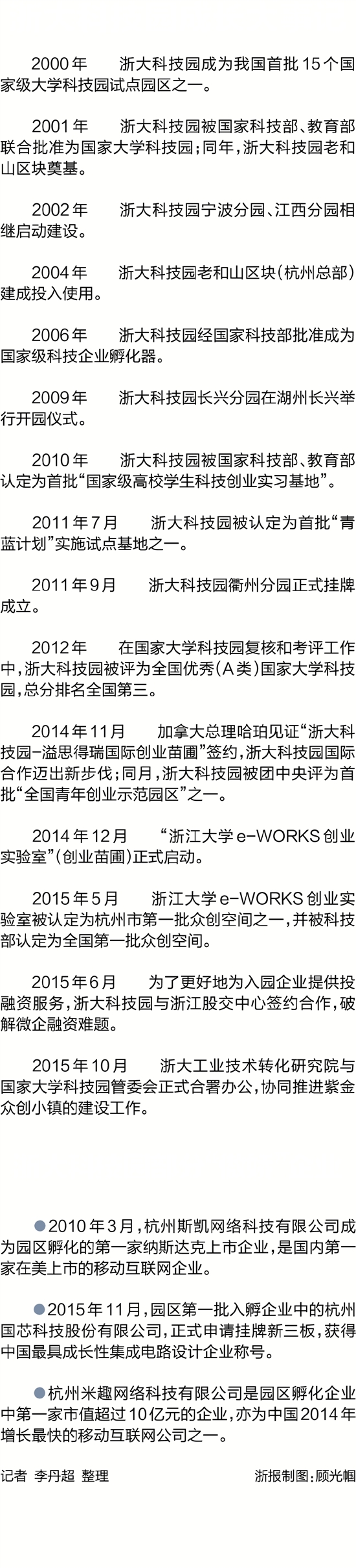 2001年 浙大科技园被国家科技部、教育部联合批准为国家大学科技园;同年,浙大科技园老和山区块奠基。
