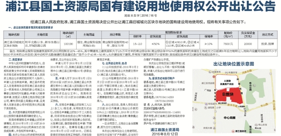 浦江县国土资源局国有建设用地使用权公开出让公告