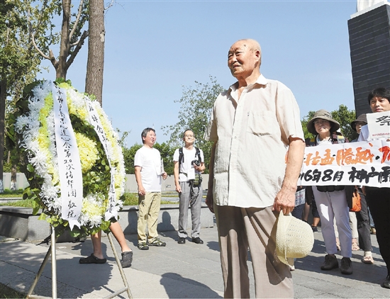 8月15日,南京大屠杀幸存者岑洪桂在“紫金花女孩”铜像前献花后致哀。 新华社发
