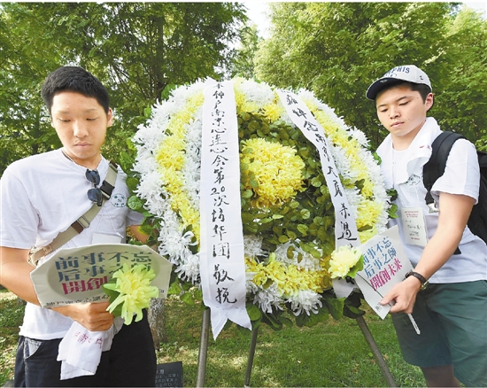 8月15日,日本友人代表在和平集会上向南京大屠杀遇难者献花圈。 新华社发