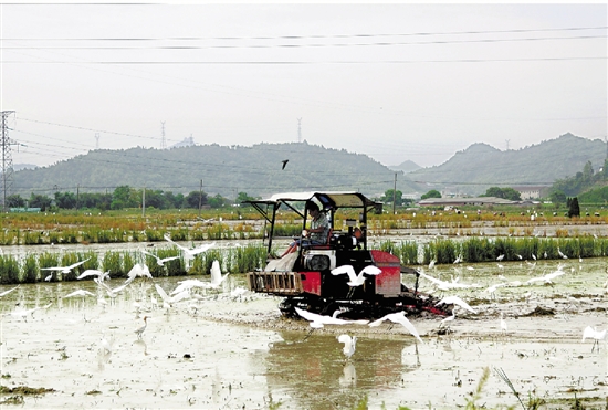 农机与白鹭共舞。 杨鹏 摄