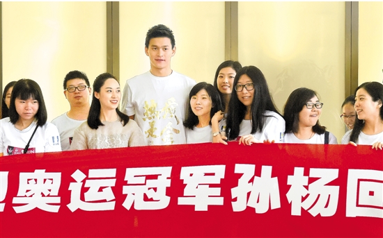 8月16日上午,奥运冠军孙杨回到杭州,在萧山国际机场受到“粉丝”的欢迎。 本报记者 潘良干 摄