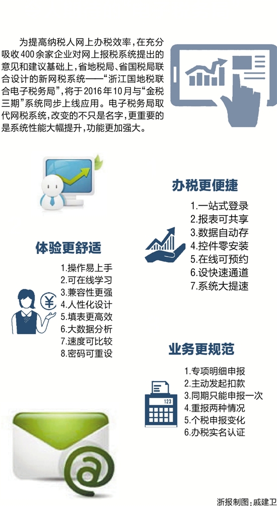 为提高纳税人网上办税效率,在充分吸收400余家企业对网上报税系统提出的意见和建议基础上,省地税局、省国税局联合设计的新网税系统——“浙江国地税联合电子税务局”,将于2016年10月与“金税三期”系统同步上线应用。电子税务局取代网税系统,改变的不只是名字,更重要的是系统性能大幅提升,功能更加强大。