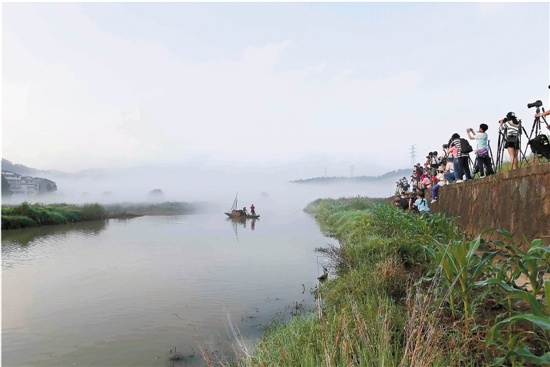 8月12日清晨,建德下涯镇之江村这一段天然的“之”字型江面和新安江奇特的雾,形成了独特的生态风景。来自江苏、江西、福建、上海等地上百名摄影爱好者在此进行摄影创作。近年来,随着“五水共治”的深入推进,这里的生态环境越来越好,天更蓝、山更绿、水更清,空气也更清新了。 本报记者 邵全海 通讯员 别阳军 摄 |
