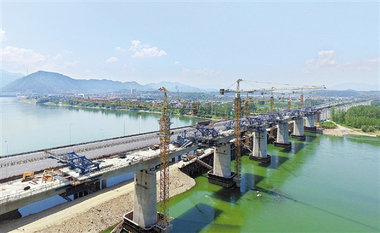 8月19日,桐庐境内的杭黄铁路富春江特大桥工地机声轰鸣,目前工程已完成大半,大桥雄姿初露。该大桥是杭黄铁路的重点控制性工程,全长为2987.41米。 本报记者 吴元峰 摄
