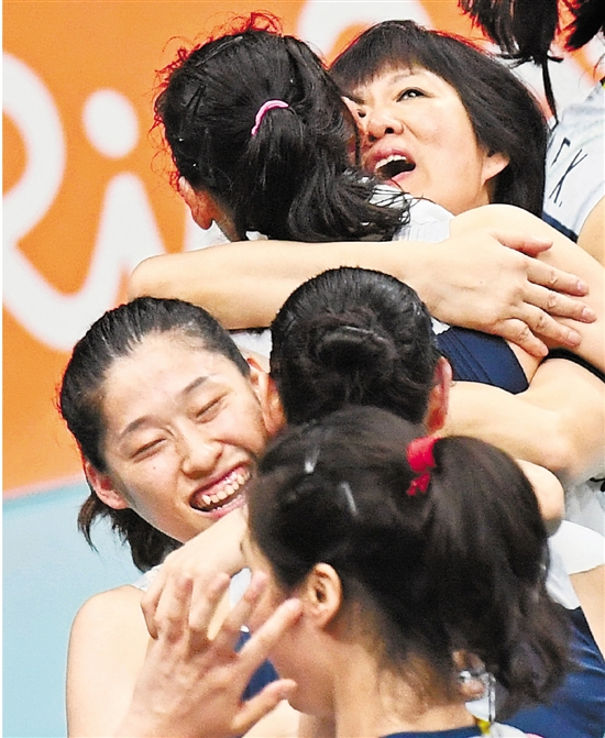 战胜荷兰队后,郎平与队员们相拥在一起。 视觉中国供图
