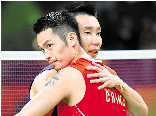 当地时间8月19日,在里约奥运会羽毛球男子单打半决赛中,中国选手林丹以1比2不敌马来西亚选手李宗伟,无缘决赛。图为赛后两人拥抱致敬。 新华社发