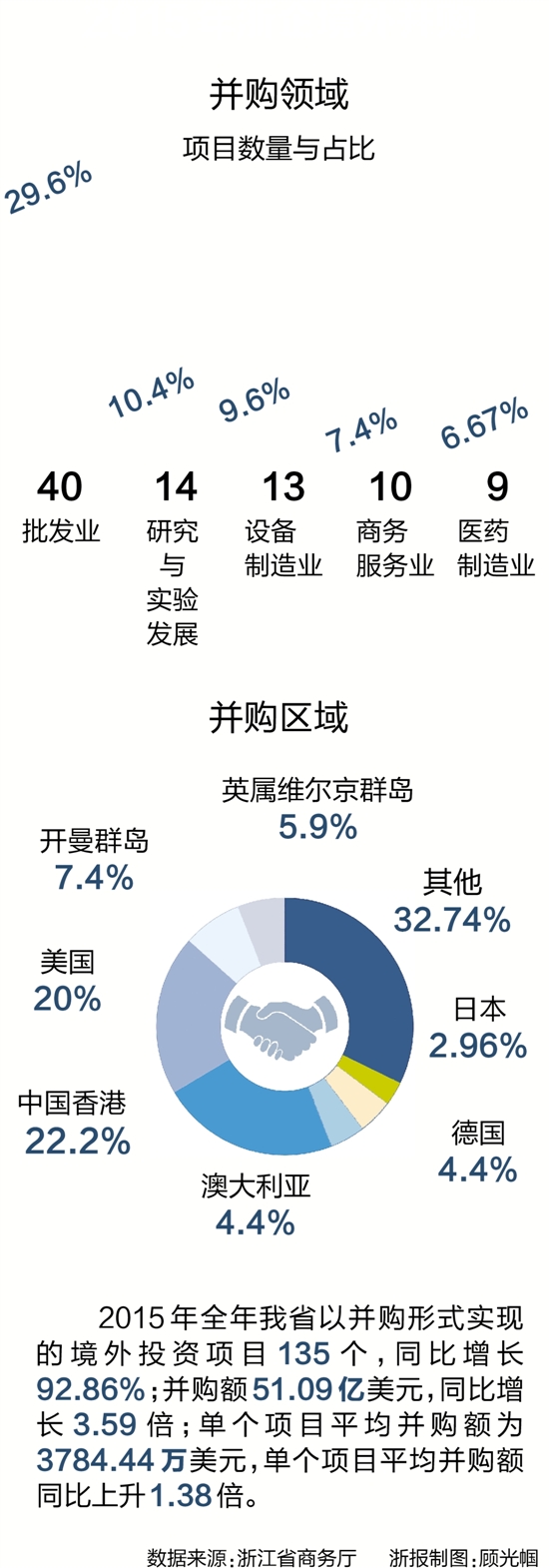 2015年全年我省以并购形式实现的境外投资项目135个,同比增长92.86%;并购额51.09亿美元,同比增长3.59倍;单个项目平均并购额为3784.44万美元,单个项目平均并购额同比上升1.38倍。