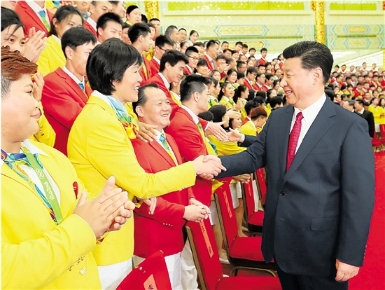 8月25日,党和国家领导人习近平、李克强、张德江、俞正声、刘云山、王岐山、张高丽等在北京人民大会堂会见第31届奥林匹克运动会中国体育代表团全体成员。