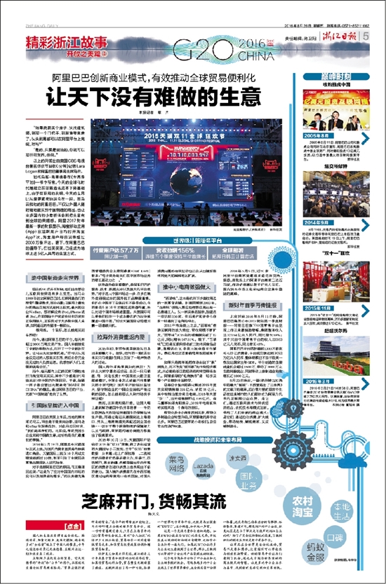 “开放之美”系列另一组,关注的是全球贸易便利化的推动者阿里巴巴。依托互联网创新贸易方式,阿里巴巴不仅让外国人随时方便地买到中国制造的商品,也让众多国内企业体会了把生意做到全球的成就感。 (详见第五版)
